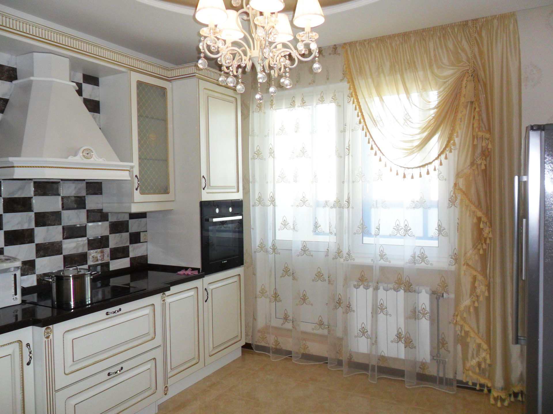 - В просторной кухне можно использовать традиционные форматы штор , которые будут перекрывать всю стену с проемом. Таким образом получится сделать интерьер завершенным, а акценты сместятся на другие детали дизайна.