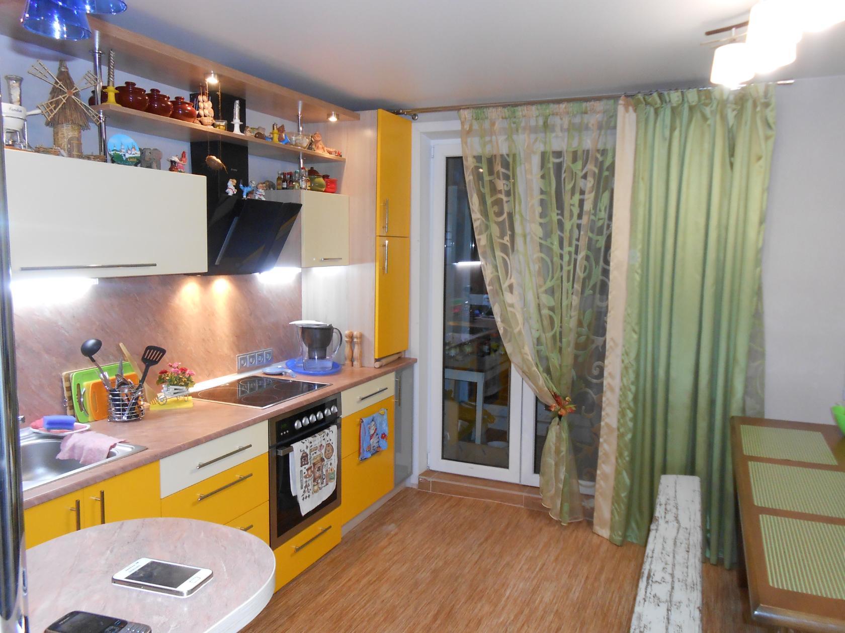 Если кухня квадратная, то длинные гардины смотрятся тоже хорошо.В таком помещении можно использовать темные ткани в сочетании со светлыми, или глубокими оттенками. Главное, повесить занавески на такой крепеж, чтобы они легко сдвигались и доступ на балкон не имел ограничений.