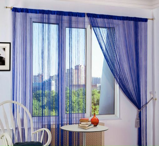 - Из нитяных штор можно соорудить гармоничные комбинации , собрав часть нитей в отдельных местах для придания дизайну проемов характерные черты выбранного стиля стиля интерьера.Такой прием позволит определить центр симметрии, акценты, основные линии и детали.