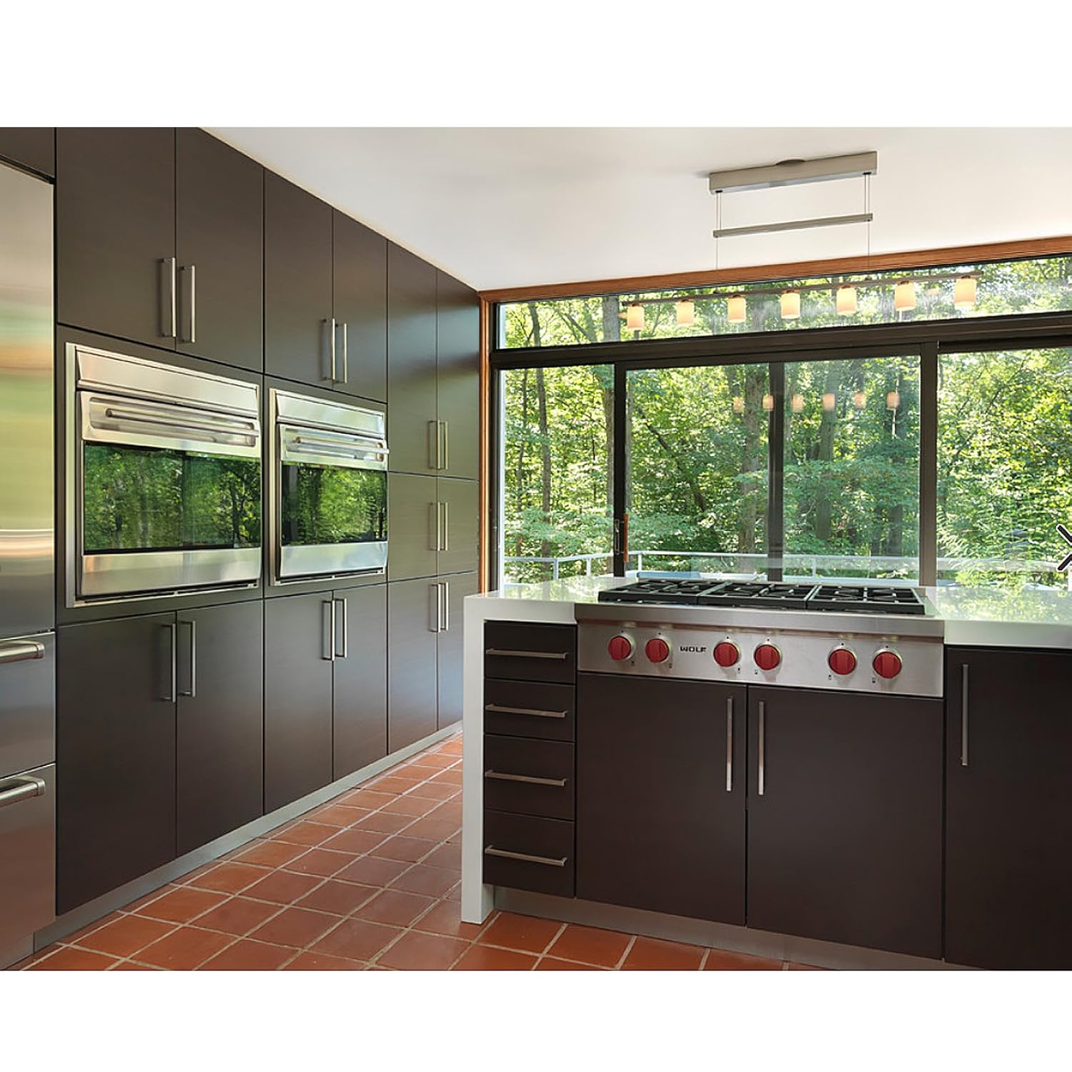 В кухне со стеклянными окнами и дверями ожидайте хороший вид на деревья вокруг нее.
