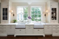 Интерьер светлой кухни с одним окном. Если кухонная мебель светлых тонов, например, белая, молочная, беж, светло-голубая, визуально пространство будет расширено, плюс она будет выглядеть более теплой и домашней. В центре окна размещается мойка, по бокам – разделочные столы. Все должно быть разделено на функциональные зоны. Слева – открытые или закрытые шкафы, можно расположить духовку, холодильник, микроволновку. Справа – варочная панель, телевизор, шкафы для хранения мелочей и продуктов.