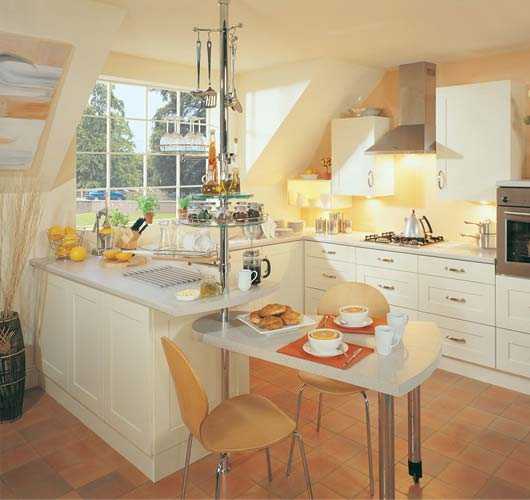 Барная стойка может быть прекрасной заменой обеденного столаВ небольших кухнях кухонные гарнитуры с барной стойкой могут быть угловые. Это прекрасно экономит место и несет те же функции. Барная стойка может быть прекрасной заменой обеденного стола. Особенно удобно, если она идет параллельно стене и кухне. Человек, который что-либо готовит, может выставлять сделанное прямо на поверхность барной стойки, просто к ней повернувшись.