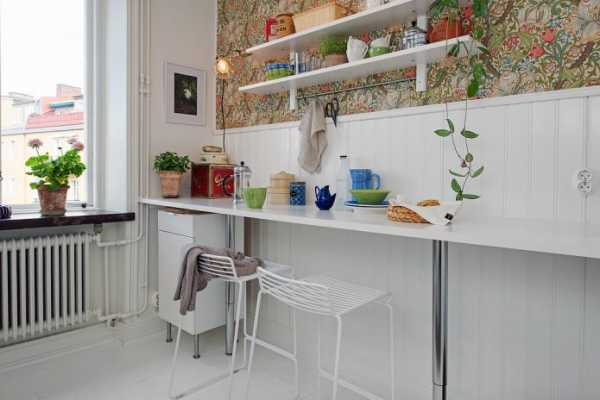Если вы не готовы к кардинальным переменам, есть вариант успешно совместить мини-стойку со столом, например, если установить ее вдоль стены или подоконника. Такая идея является отличным вариантом для маленьких помещений, позволяя увеличить поверхность столешницы практически до привычных всем размеров. Конечно, сесть за такой стол возможно лишь с одной стороны, но к этому можно быстро привыкнуть.
