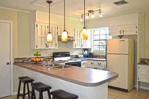 Маленькие кухни с барной стойкой очень нуждаются в зрительном увеличении пространства. Решить эту проблему поможет правильно установленное освещение. В первую очередь это галогенные лампы, точечная подсветка по периметру потолка и в верхней части барной стойки. Свет на маленькой кухне должен быть достаточно ярким, но желтоватым. Люминесцентных ламп лучше избегать, поскольку их голубое свечение искажает цвет еды и вызывает у человека чувство тревоги. Оригинально будут смотреться споты, трековые светильники и барные люстры.