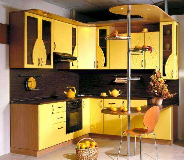 Фото дизайна кухонного гарнитура ясно демонстрируют, что креатив не теряет актуальности. Очень приятный интерьер получается, когда дизайнеры используют при работе теплые тона и овальные линии. Все, что может напомнить о золотом летнем солнце, очень позитивно действует на сознание жильцов.
