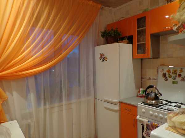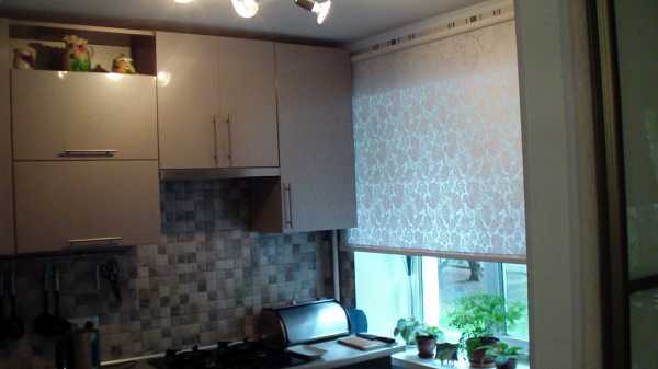 Шторы для кухни стоит выбирать светлых тонов. Римские шторы или жалюзи вполне подойдут для интерьера кухни в хрущевке.
