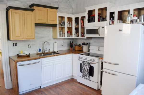 Верхние шкафы надо делать до самого потолка. Во-первых, дополнительное место для хранения. Во-вторых, наверху не будет скапливаться ненужный хлам, пыль и грязь, которые, если у вас неправильно работает вентиляция, со временем заламинируются слоем жира. В-третьих, это просто выглядит более современно. Их можно сделать распашными с высокими дверцами — это самый дешёвый вариант т.к. петли с доводчиками на распашные дверцы стоят $2-3 за штуку. Или сделать сверху открытые полки.