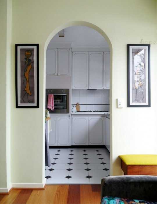 Двери можно убрать, если есть хорошая вытяжка. Либо заменить выдвижными или дверью-гармошкой. Если все же есть возможность снять дверь, тогда арочный проём значительно увеличит ощущение большего пространства.