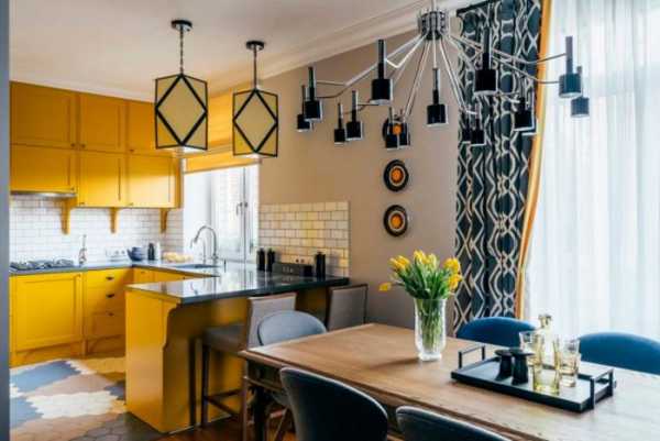 С темными цветами стоит быть осторожнее. Их в небольшом количестве можно использовать, например, в дизайне обеденной зоны, в декоре, в оформлении осветительных приборов. Можно сделать двухцветный гарнитур с темным нижним рядом, или наоборот.