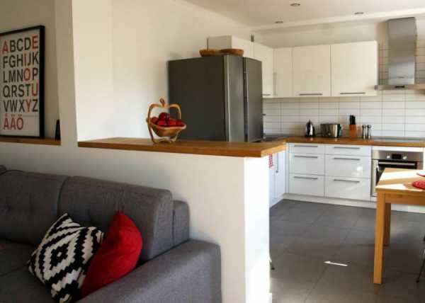 Помещение вмещает всю необходимую технику, но не остается места для столовой. Ее организуют в гостиной.- Без верхних шкафов.