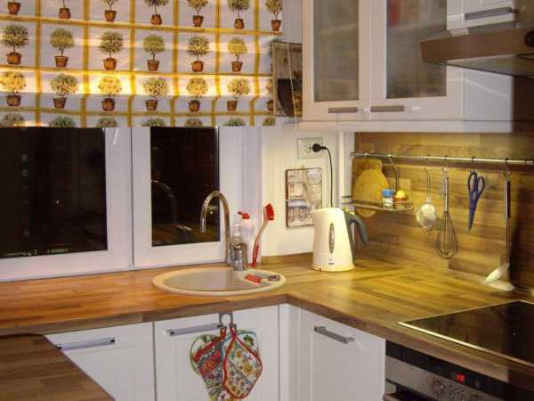 Над подоконником при желании можно установить держатели под бокалы, что так же сэкономит пространство шкафов.