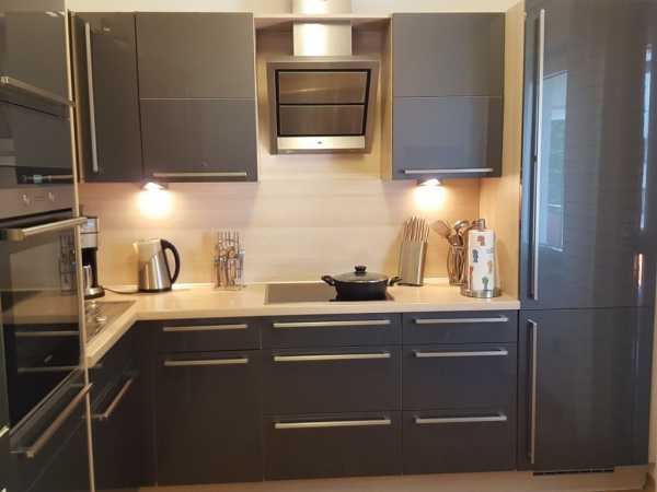 Г-образный гарнитур, располагаемый вдоль двух смежных стен. Угол также задействован – в нем обычно оборудуют мойку. А две рабочие поверхности отнюдь не будут лишними.