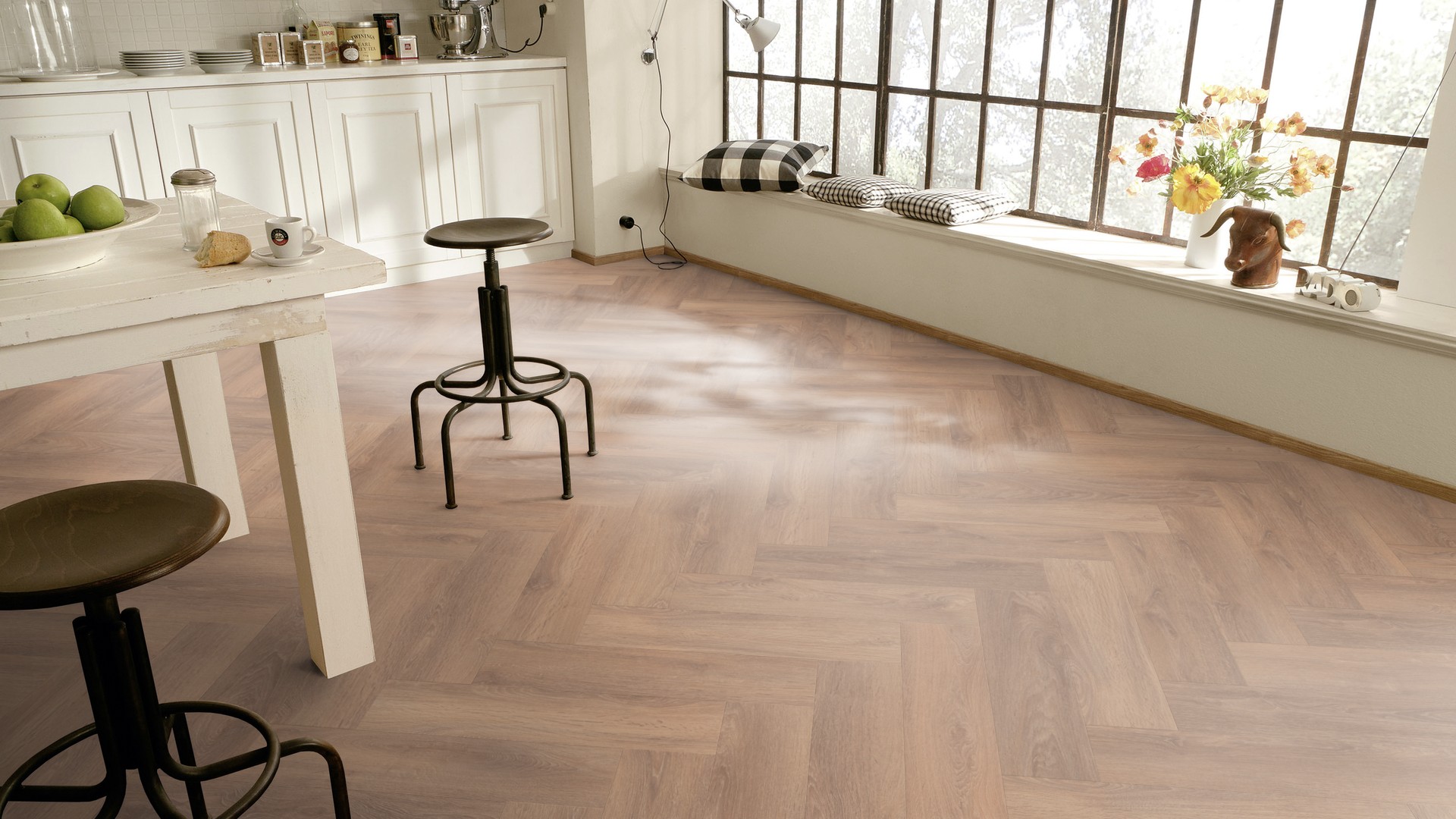 Она создана для ценителей естественных и экологически чистых материалов. Укладка «английская елка» добавляет изыску и утонченности напольному покрытию. Ламинат модели Уайтхолл послужит прекрасным фоном для оформления помещения в классическом стиле или сгладит яркие цвета в стиле Бохо.