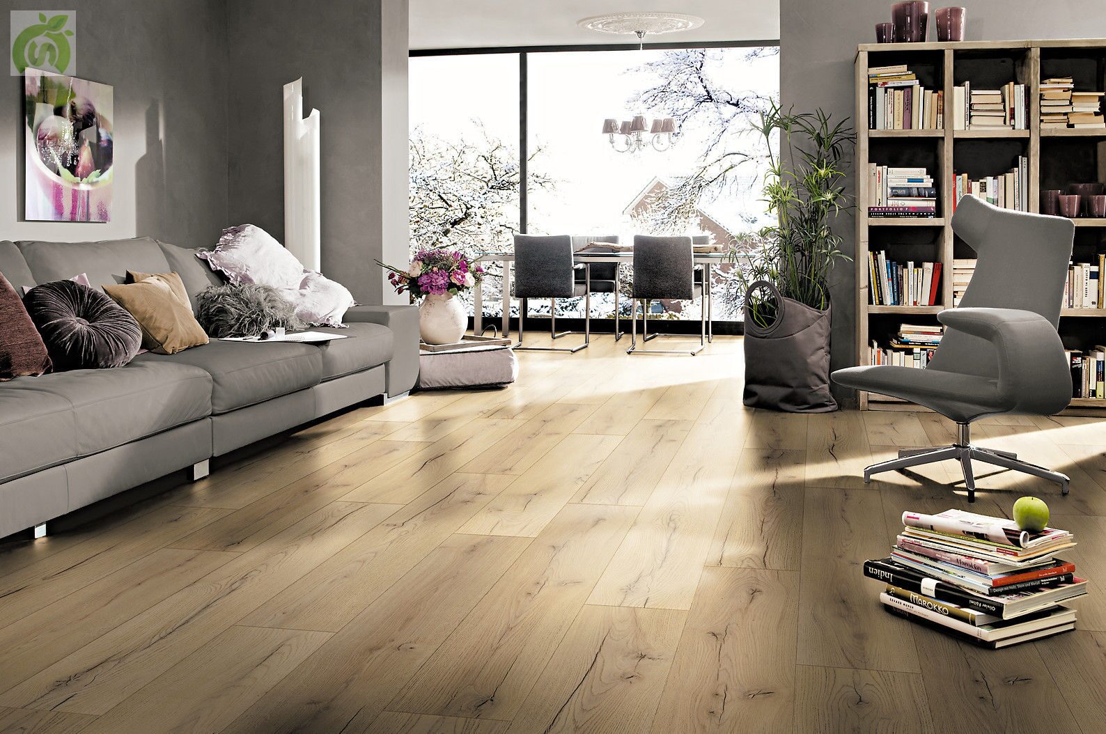 особенности и размеры покрытий 32 и 33 класса, сертификаты на продукцию, отзывы покупателей, вариант беленого дуба в современном интерьере