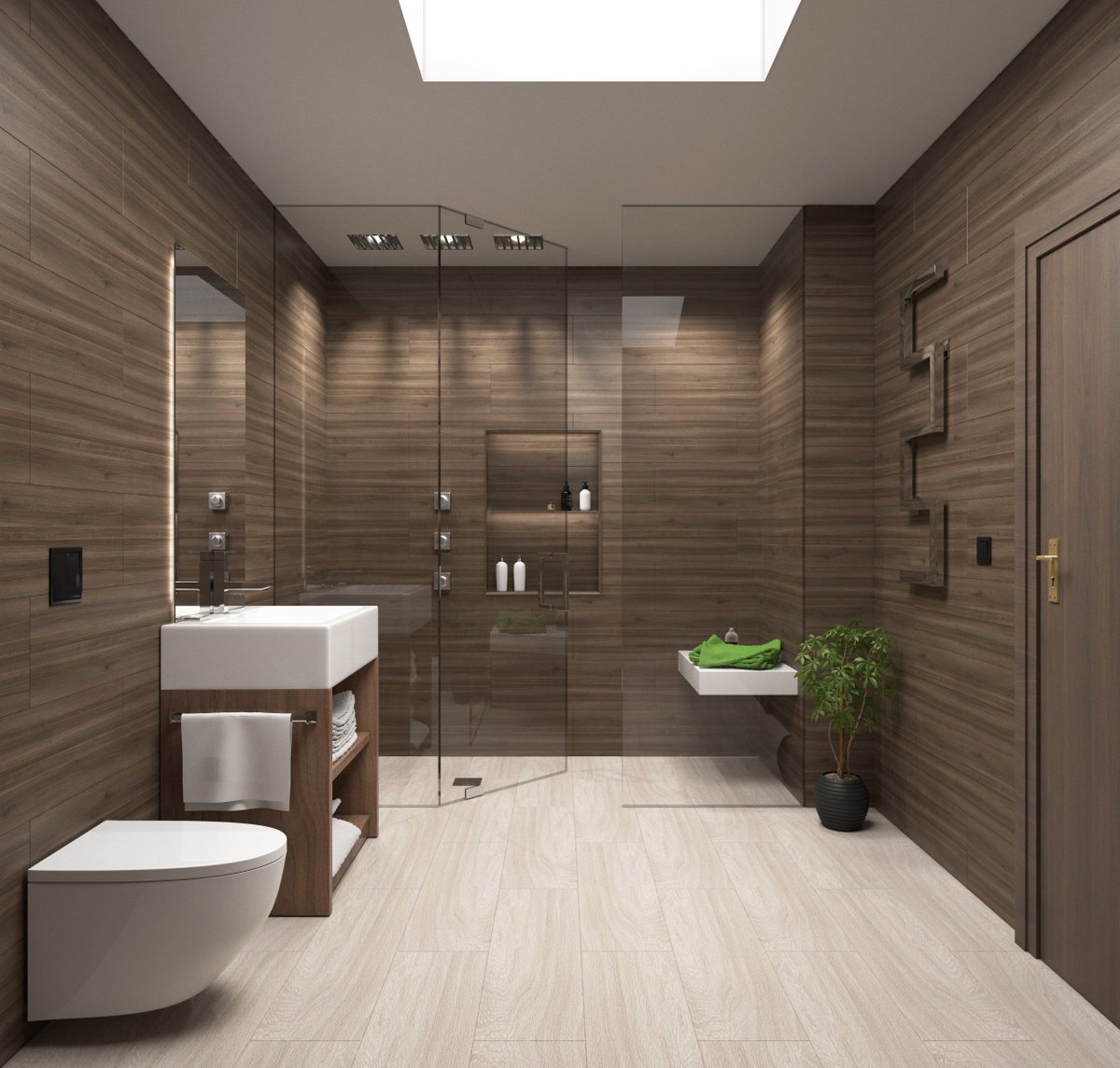 Можно легко совместить другие элементы основной ванной комнаты с паркетным полом, потому что они нейтральны. Самые популярные цвета стен включают те же варианты, что и пол, с добавлением синего. Этот оттенок кажется очевидным для комнаты, полностью посвященной воде. Это также приносит ощущение спокойствия и безмятежности, которые могут улучшить спа-процедуры.