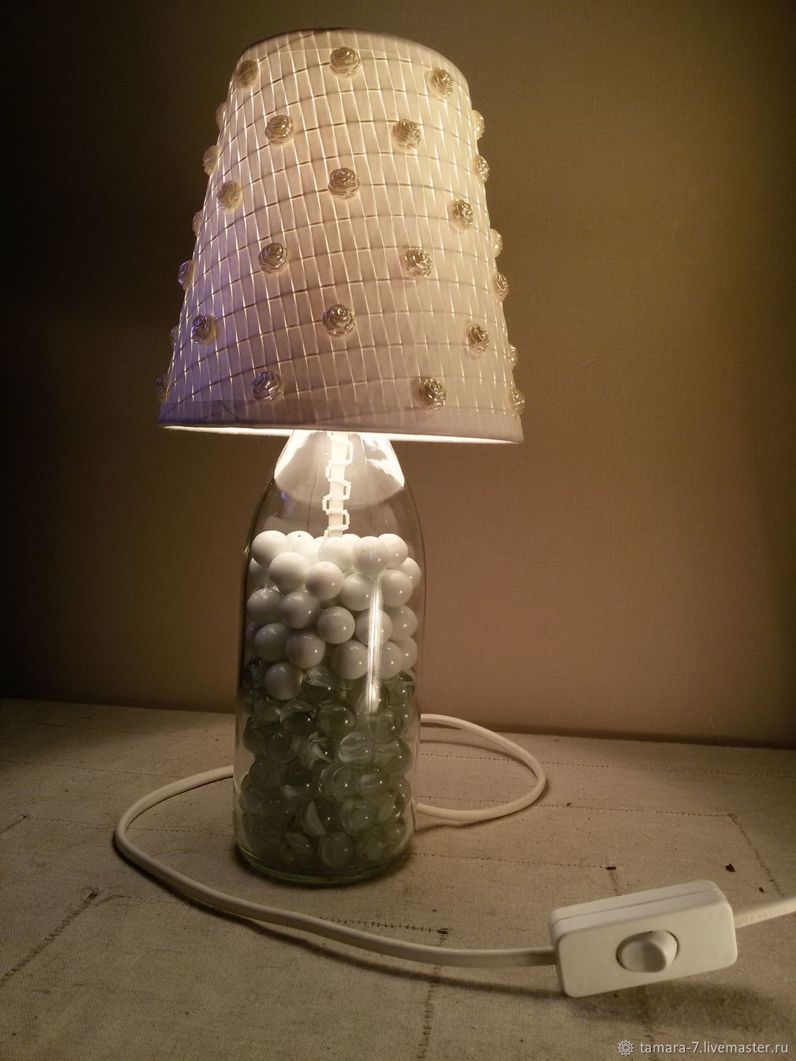 Настольная лампа своими руками из камешков марблз, страз, бисера, ракушек, блестящих монеток — все это готово стать роскошным светильником в восточном стиле. Камушки и осколки приклеиваются не горячий клей или обычный клей «момент» к кольцам опоры. Монетки просверливаются дрелью и скрепляются проволокой или леской.