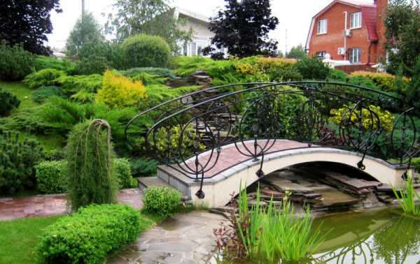 - Использование садовых мостиков. Данный прием поможет превратить дорожки на участке в увлекательные, приковывающие внимание маршруты. Использование мостиков (симпатичных помостов) позволит украсить придомовую территорию, и визуально увеличить пространство. Интерес вызывают авторские мостики, исполненные из всевозможных материалов – дерево, камень, металл и пр. Такие изделия заказывают или делают самостоятельно. Все зависит исключительно от строительно-монтажных навыков человека;