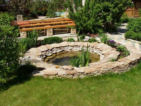 - Водоем. Декоративные водоемы располагаются на больших и маленьких участках. Дизайнеры делают их центром композиции, от которой «отталкивается» вес проект. Они отличаются по форме, оформлению и размерам. Встречаются варианты, в которых плавает живая рыба;