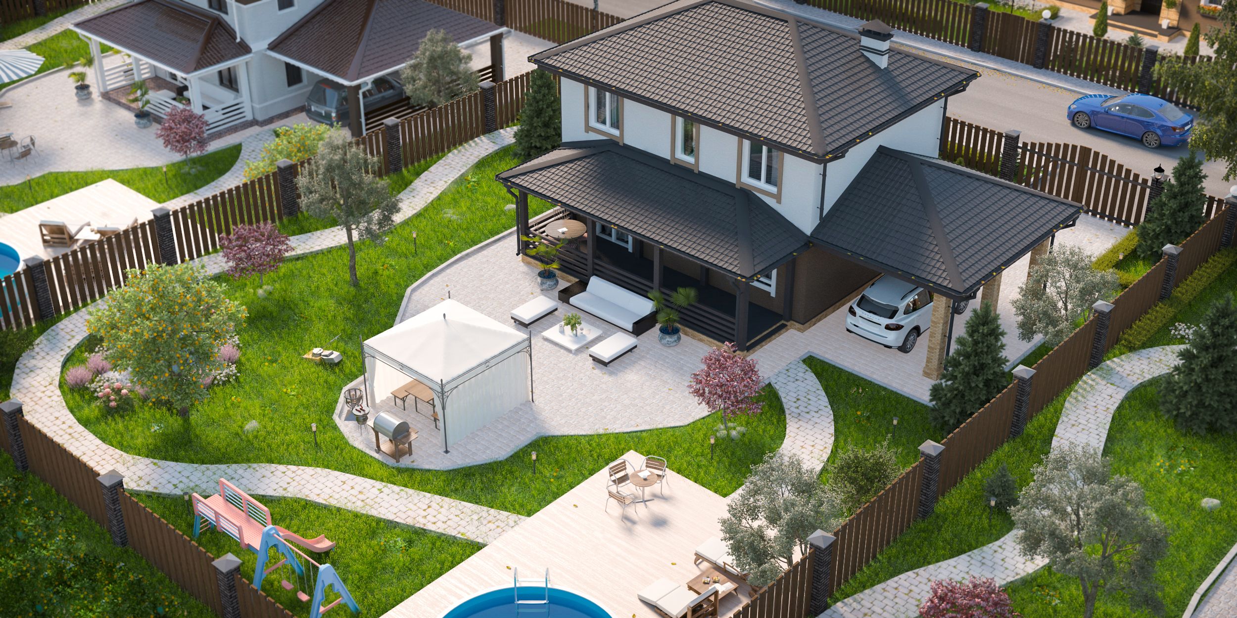 Также обязательно выделить место для навеса под машину или гаража. В зоне отдыха неплохо оборудовать маленький бассейн, неподалеку разместить детскую площадку, продумав аспекты безопасности.