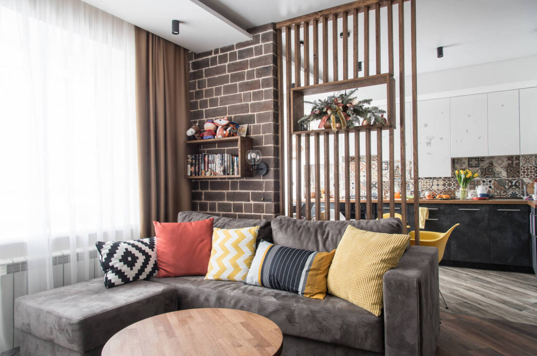 Этот вид дизайна является традиционным решением для разделения комнаты. Это звуконепроницаемые, влагостойкие, прочные и долговечные стены, с помощью которых вы можете создать любую форму. Для изготовления стационарных конструкций используют кирпич, дерево, стекло, гипсокартон, пеноблоки.Декоративную стену не всегда можно украсить подвесными полками. Кирпичная структура идеальный смысл. Другие материалы не предназначены для крепления к нему шкафчиков, картин. Вы можете использовать зонирование: