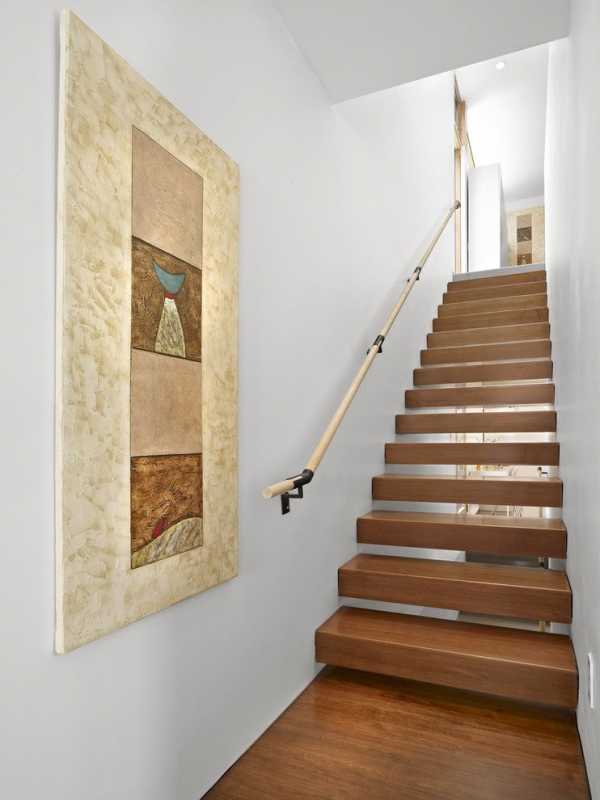 Средства выразительности сведены к минимуму: фактура материала, плавность линий, естественная цветовая гамма. Отличное решение — ступени на больцах.