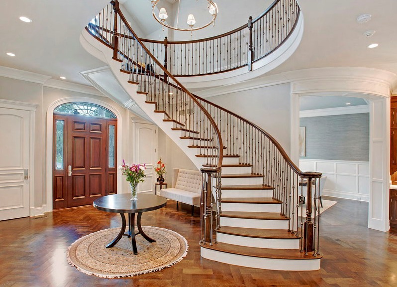 Особенно изящно смотрятся лестницы на второй этаж, имеющие криволинейные марши. Их созданием занимаются высококлассные проектировщики и мастера, так как процесс этот достаточно сложный.