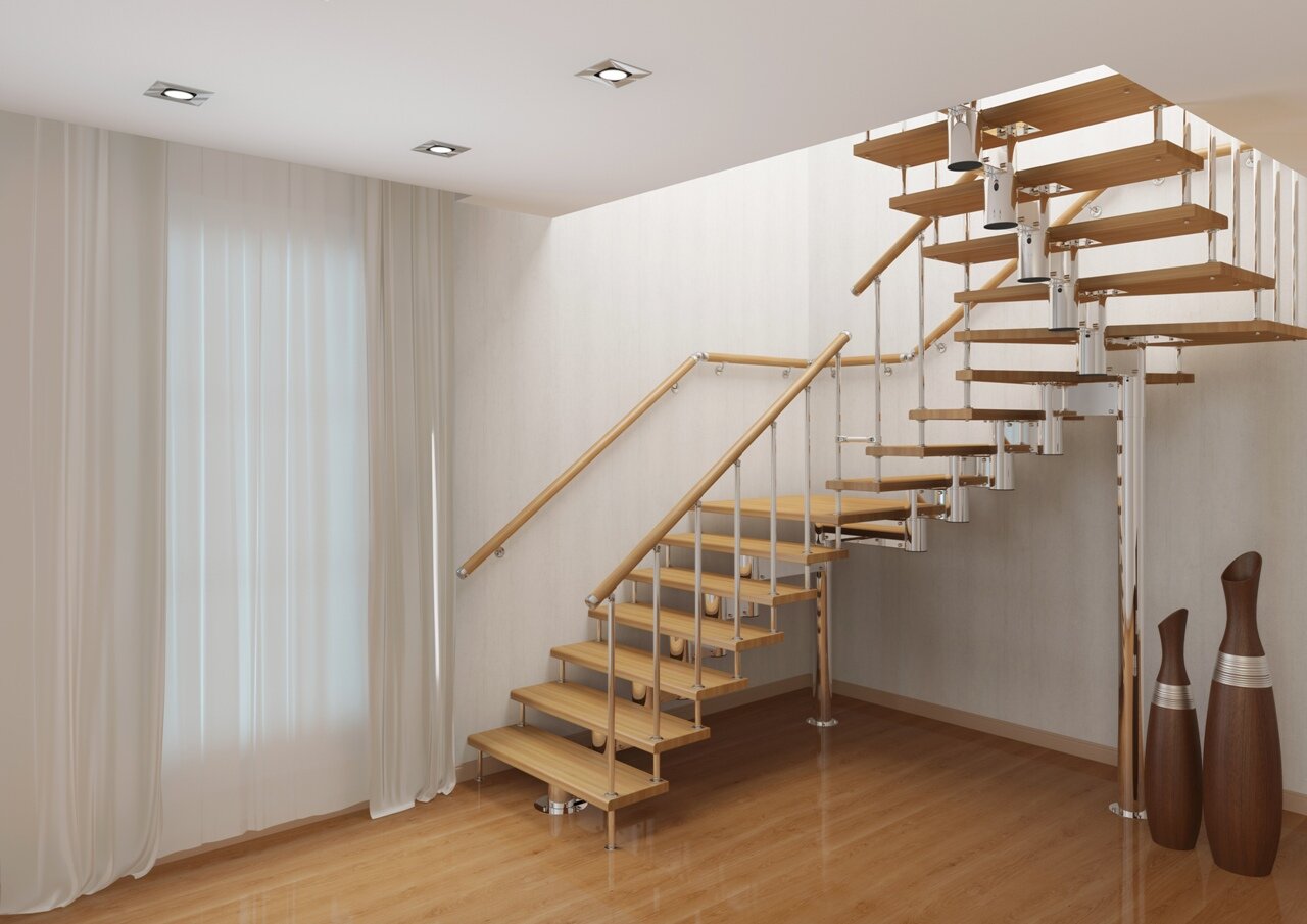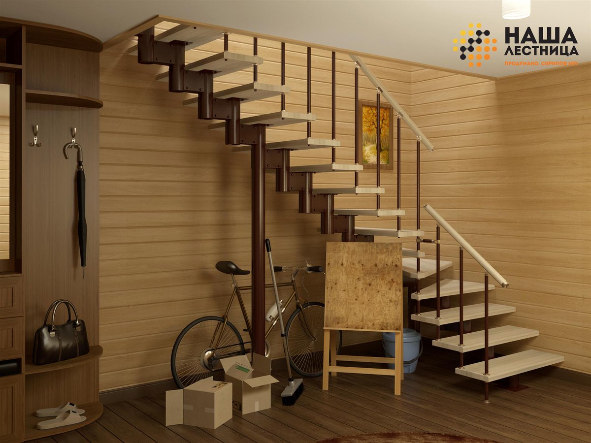 - Можно устанавливать даже если отделочный ремонт в лестничном пролете закончен. Так как не предполагается грязных работ, которые неизбежны при сварке металлической лестницы или заливке бетонных ступеней.