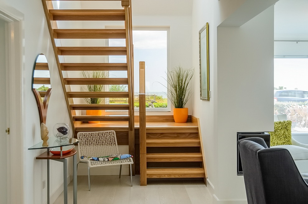 Фото лестницы в доме на второй этаж с маршем расположен вблизи окнаИсточник houzz.esЕсли стационарного и естественного света не достаточно, ступени оборудуют небольшими точечными led светильниками, которые устанавливают в вертикальной плоскости подступенка.
