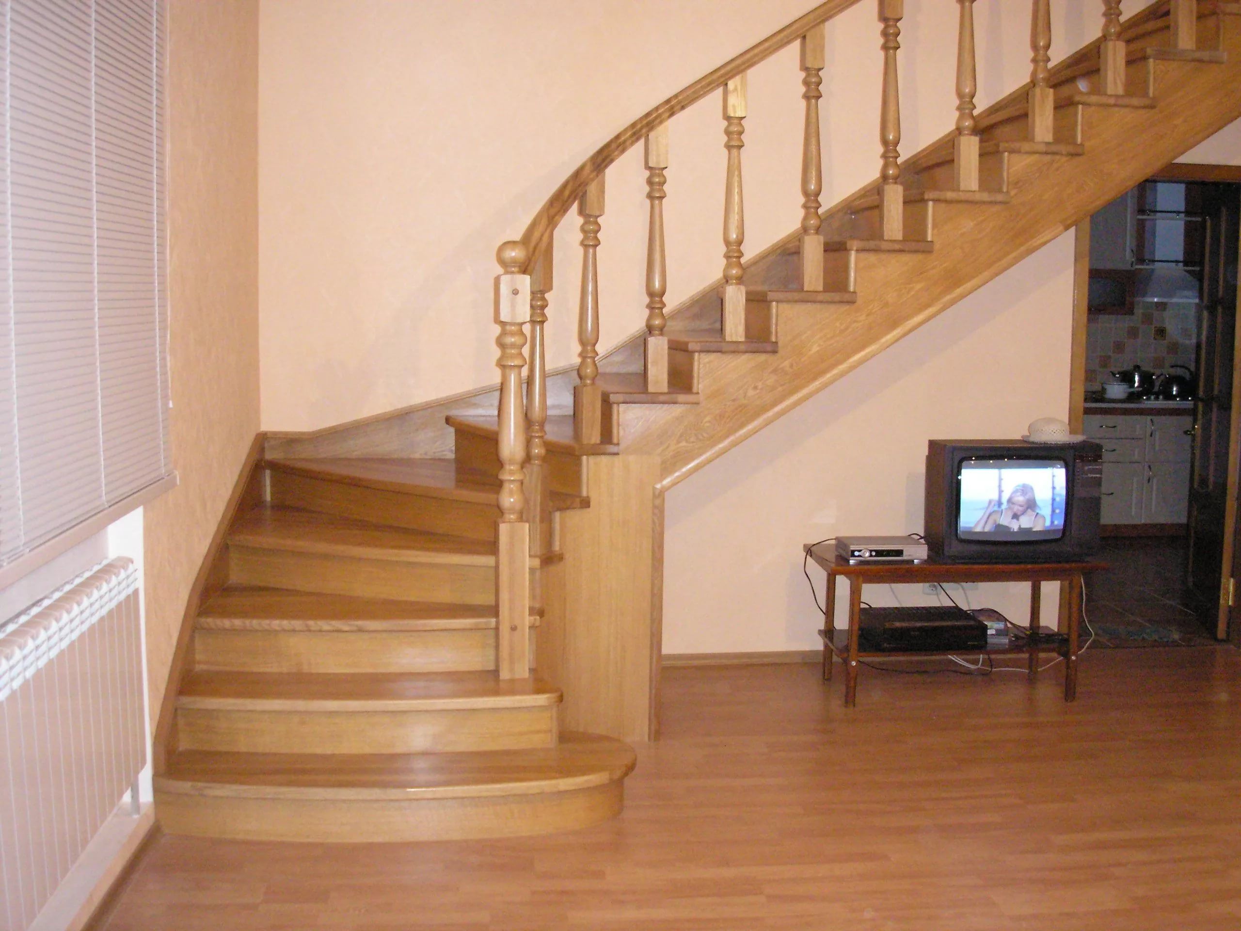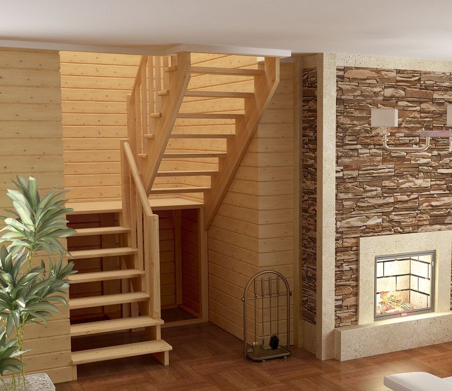 - Деревянная лестница на второй этаж своими уками