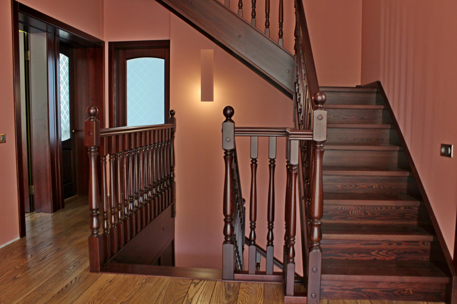 . В деревянном дачном коттедже скромных размеров будет неуместно и громоздко смотреться широкая покатая лестница с массивными перилами из камня или мрамора. В то время как квартира в стиле минимализма с авторским дизайном потеряет оригинальность, если оборудовать в ней стандартную деревянную лестницу.