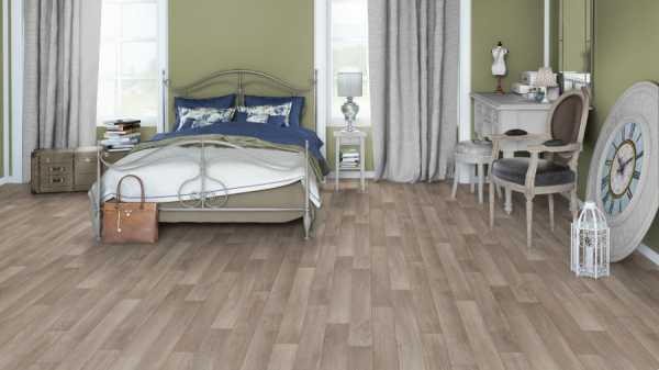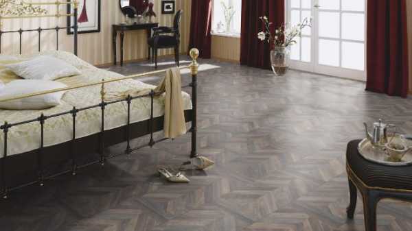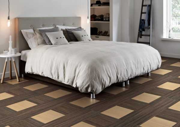 На фото пол в спальне, облицованный линолеумом, имитирующим паркетную доску.