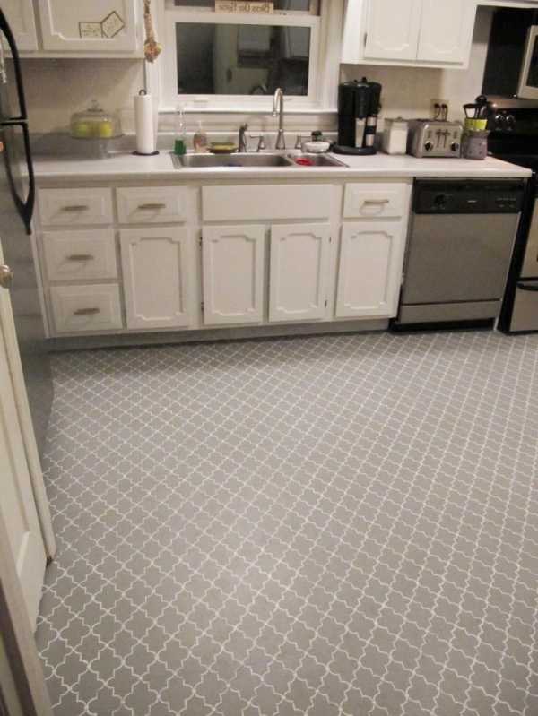 На фото светлый напольный линолеум с цветочными узорами в интерьере кухни.