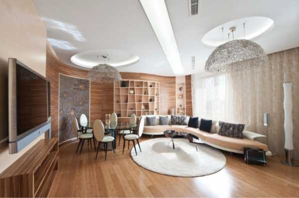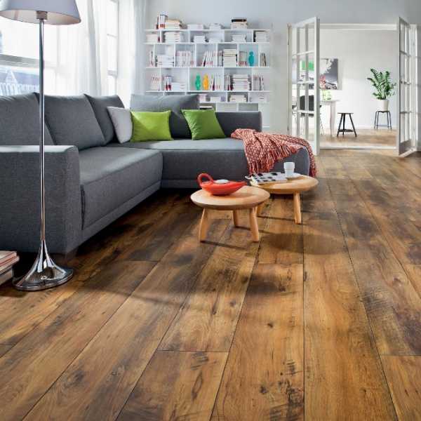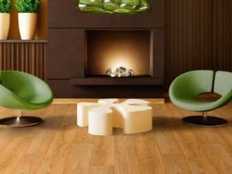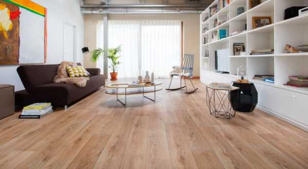 Чаще всего для гостиной применяют бытовой тип покрытия с имитацией благородных пород дерева, ламинатной или паркетной доски, которое всегда смотрится очень эффектно. В просторной комнате с небольшим количеством мебели можно использовать глянцевое покрытие с блестящей и сияющей поверхностью.