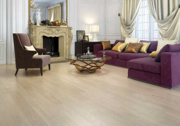 - Гостиная. Выбор в зал может быть самым разнообразным, зависящим от ваших предпочтений и габаритов помещения. Коричневый цвет или любые оттенки, имитирующие благородные породы древесины, прекрасно подойдут к элегантным стилям (классика, арт-деко, модерн). Не менее роскошно будет смотреться и линолеум под беленый дуб. Такой вариант подойдет для просторной гостиной, в сочетании с темными или, наоборот, яркими насыщенными оттенками мебели и портьер.