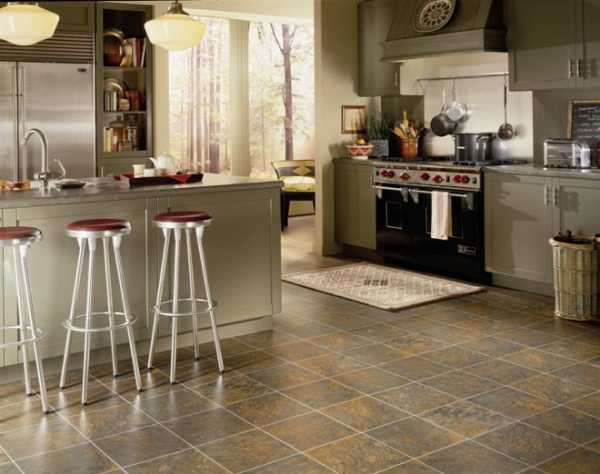 Это достаточно оригинальное решение интерьера, предоставляющее разные возможности дизайна. Линолеум под плитку не обладает устойчивостью к истиранию и высоким температурам, зато на нем труднее поскользнуться, да и он совершенно нечувствителен к механическим воздействиям, которые для плитки часто фатальны. Еще он дешевле, и его проще уложить на пол.