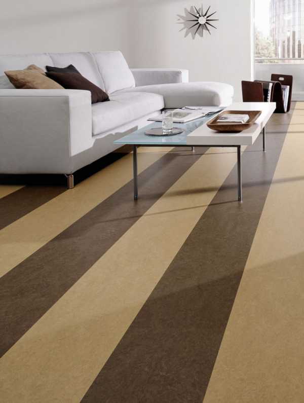 - пастельные оттенки. Светлый линолеум в интерьере, фото которого обычно выглядят так эффектно, визуально расширяет помещение и делает его просторнее. Хорошо смотрится в минималистских современных стилях, может имитировать беленый или пробковый пол, деревянный ламинат или паркет. Подходящее решение для студий;