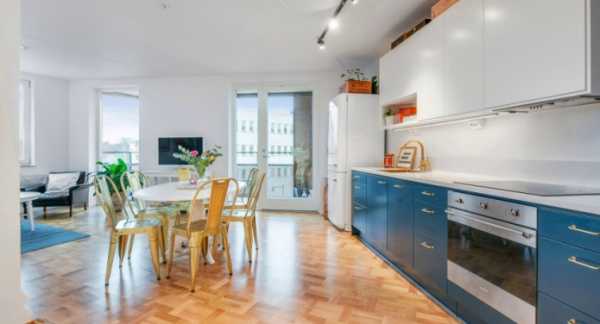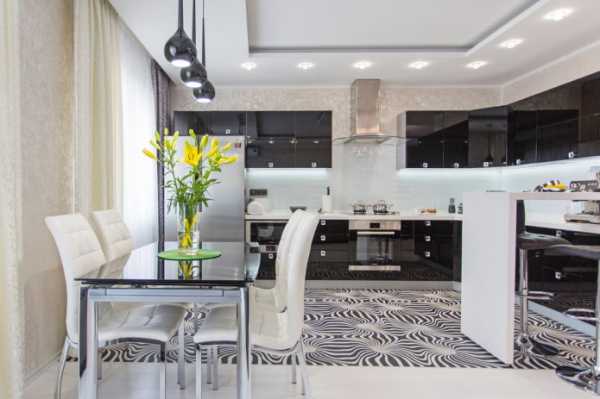 На фото пол, облицованный линолеумом в интерьере кухни-столовой.