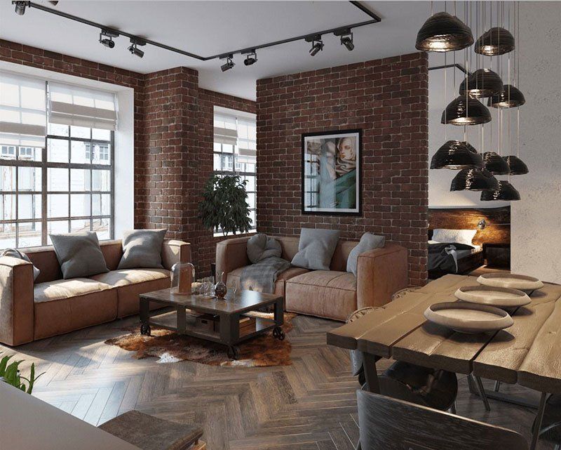 Это объясняется тем, что все текстуры, используемые в этом стиле, как правило, необработанные: натуральное дерево, металлические трубы и светильники, кирпичная кладка, бетонные стены.