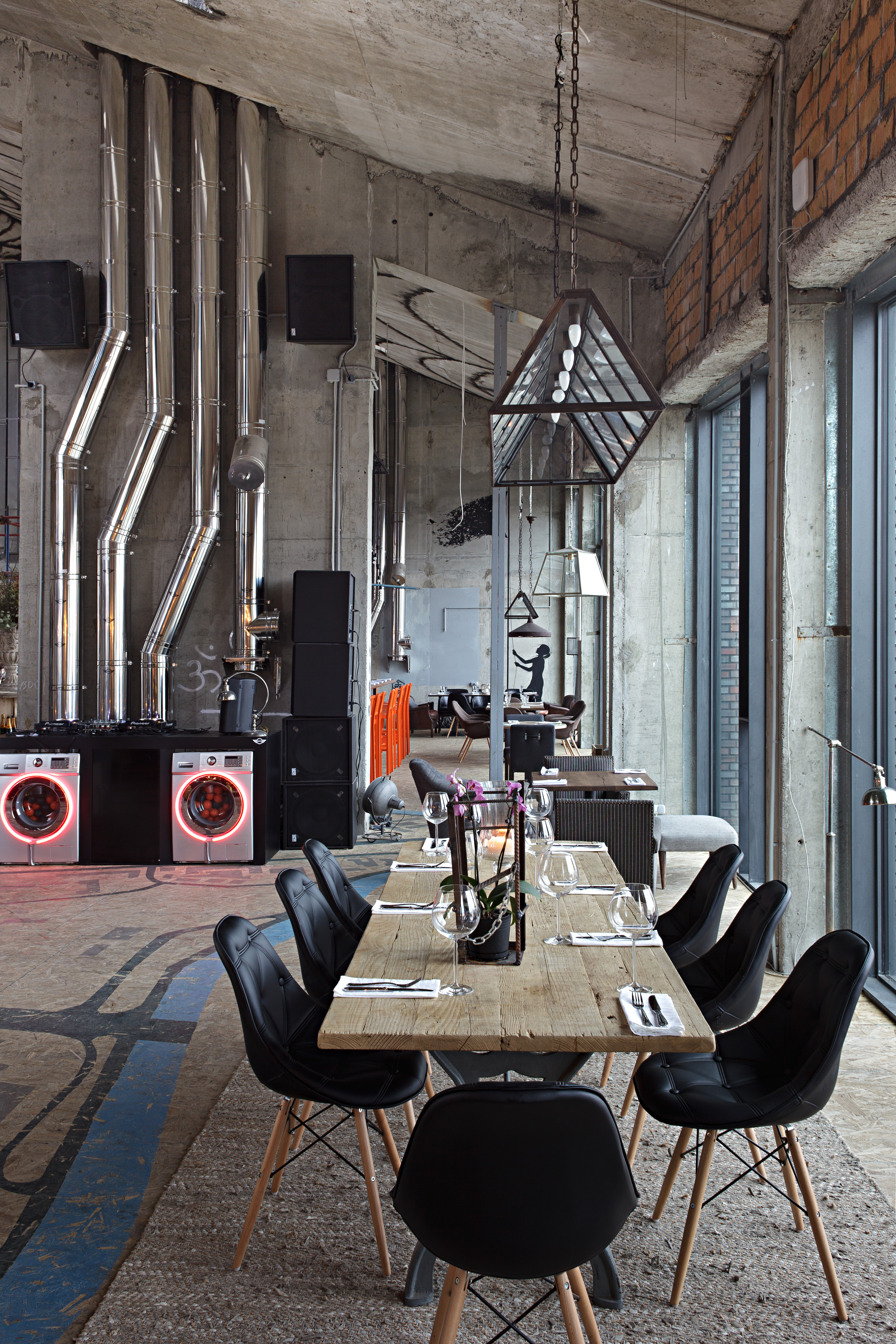 - огромные окна, панорамные стеклянные стены — в таких заведениях очень удобно проводить различные мероприятия, например, свадьба в ресторане в стиле лофт. Ресторан с таким хорошим дневным освещением отлично подойдет для создания хороших снимков;