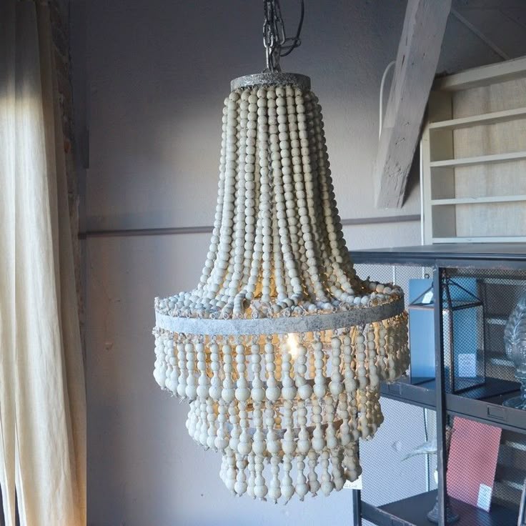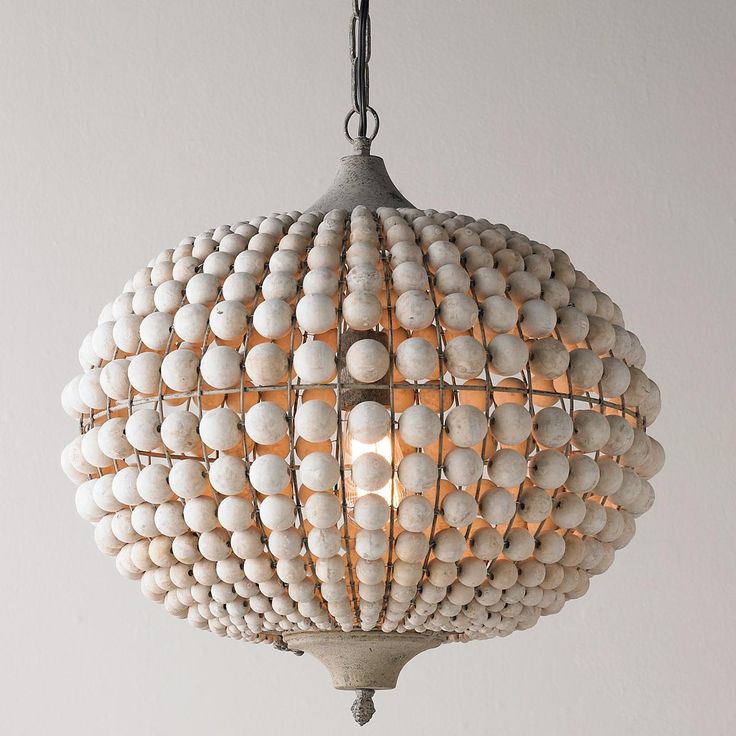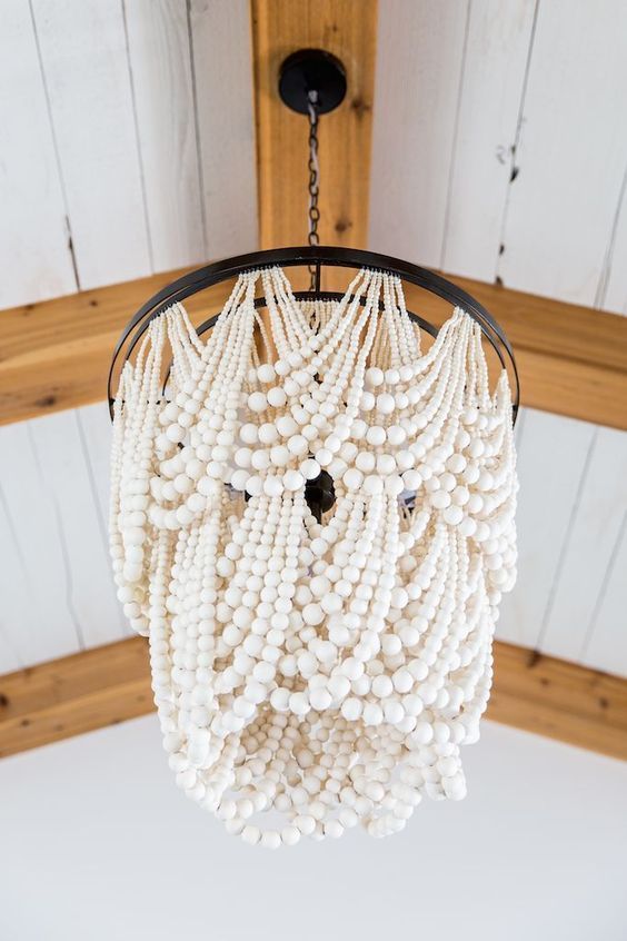 В качестве основы для новой люстры возьмите крепкое металлическое кашпо для цветов или корзинку для мытья фруктов. Бусины из светлых пород деревьев смогут собой улучшить вид классического интерьера, если сделать форму люстры под него, например, каскадом в два или три яруса.