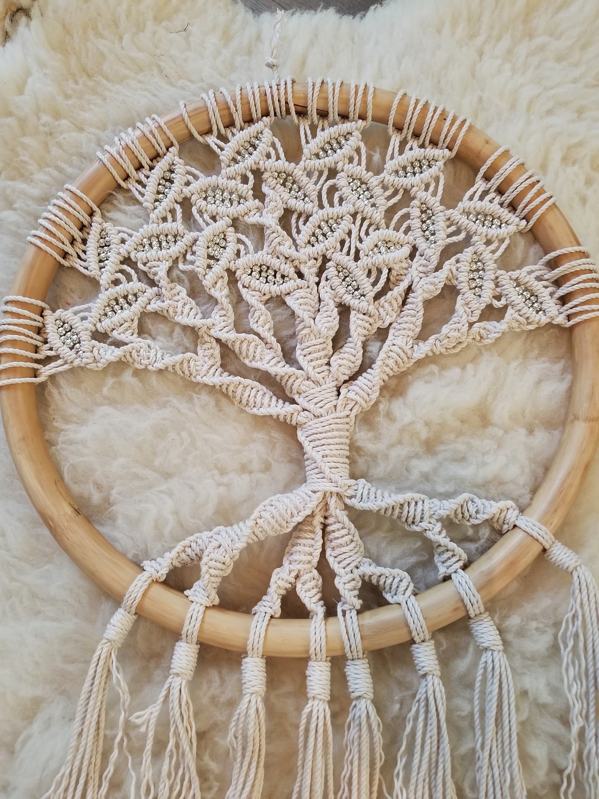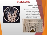 Макраме — это вид ткани, созданный с использованием техники вязания узлов, а не ткачества или вязания. Узлы квадратные и образуют полную и двойную полусцепку. Для ремесла требовались только недорогие и доступные материалы, такие как хлопковый шпагат, конопля, кожа или пряжа, а для украшения изделия использовались различные бусины.