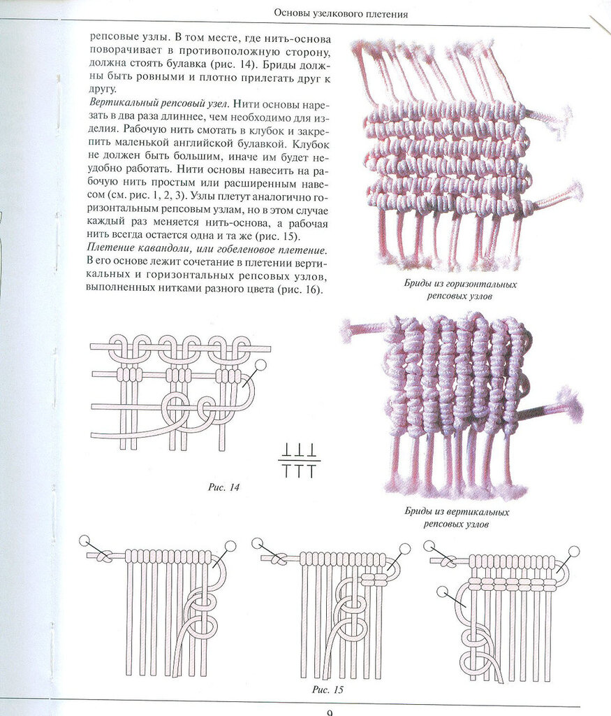 Вместо этого, образцы макраме описывают, как расположить узлы и косы, чтобы получить длинную нить макраме (сеннит), а несколько нитей можно объединить для создания более крупного проекта.