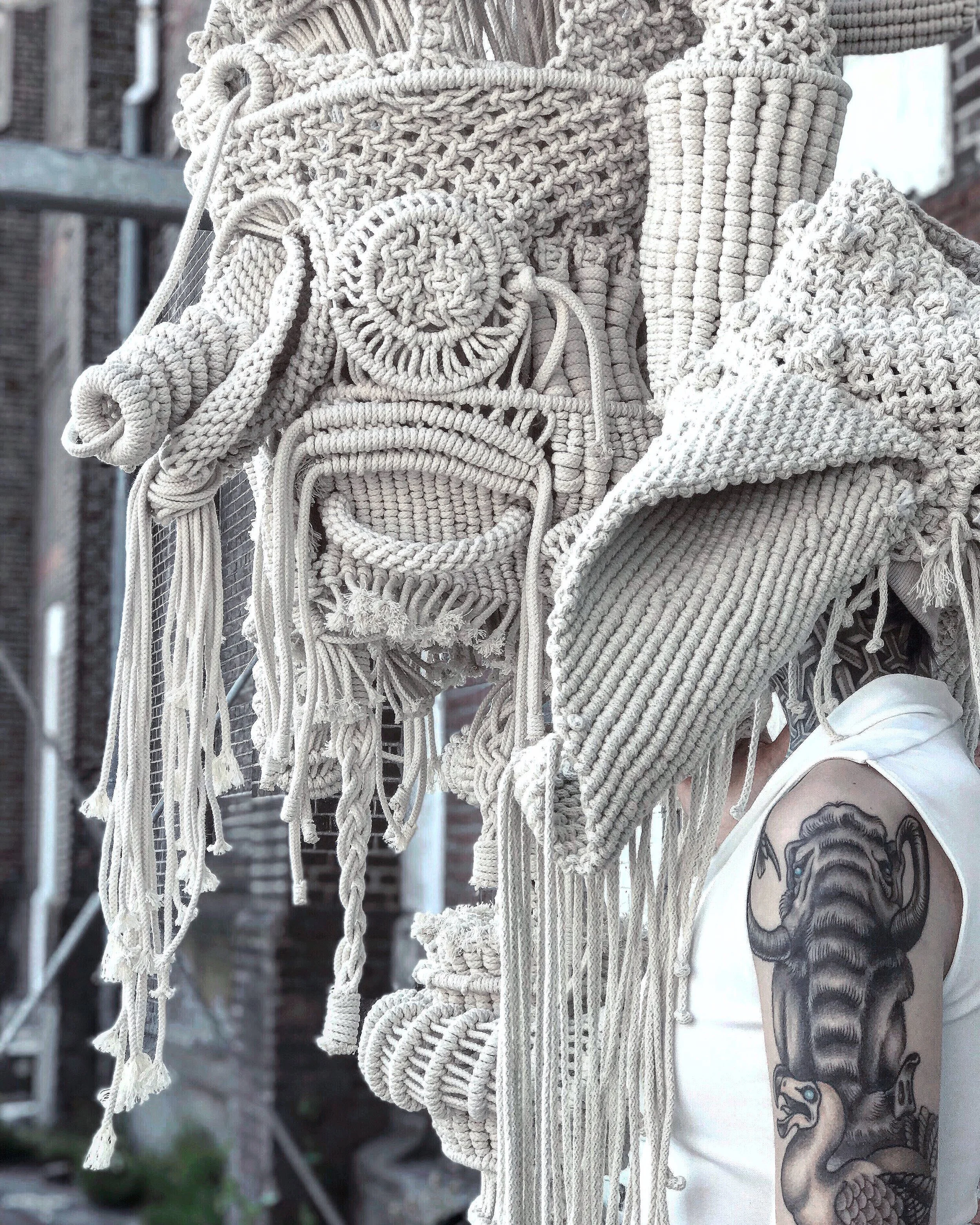 На фото Майкла Габриэля выше размером 25 × 30 футов.монстр макраме! Работа заняла более 150 часов в течение трех недель. Он включает в себя около 16 тысяч футов веревки (чуть более трех миль) и 25 футов медной трубы. Помимо макраме, Майкл также занимается иллюстрацией и вышитыми деревянными скульптурами.