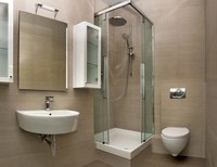 При выборе вида душевой кабины для небольшой ванной лучше остановиться на угловой модели с глубоким поддоном, которую можно будет использовать как ванну.- Чтобы максимально сэкономить место, следует установить стиральную машину под умывальник, над умывальником разместить шкаф с зеркальными дверцами.
