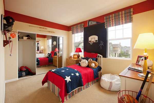 В интерьер оборудованной таким образом, комнаты прекрасно вписывается спортивное снаряжение. Помимо кровати в комнате, допускается присутствие компьютерного стола и стула, излишки мебели убираются, что заметно упрощает процесс уборки. Последнее немаловажно, если речь идет не о детской комнате для школьницы, а о детской комнате для подростка мальчика, фото которой можно найти ниже. Размер комнаты варьируется между 5 — 9 кв. метрами и 10 — 20 кв. метрами.