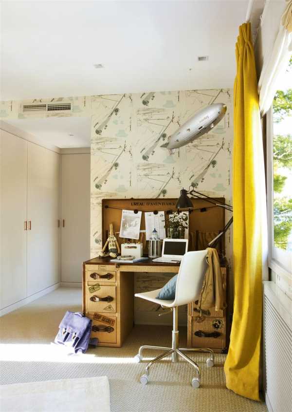 - Рабочего места. Должно находиться в максимальном отдалении от спального, как вариант, в противоположном углу. Здесь должен находиться письменный стол, стеллаж для книг, тетрадей и учебников, компьютер. Детская комната для мальчика школьника должна иметь продуманный дизайн, фото такой комнаты можно увидеть ниже. Особое значение комфорту рабочего места придают 14-20-летние юноши.