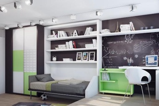 Зону сна не нужно акцентировать, кроме того, она должна быть функциональной. В маленькой комнате можно обустроить кровать на втором ярусе, например, над местом для занятий. Помимо этого, кровать может быть откидной или выдвижной: убираться днем в ящик или шкаф.