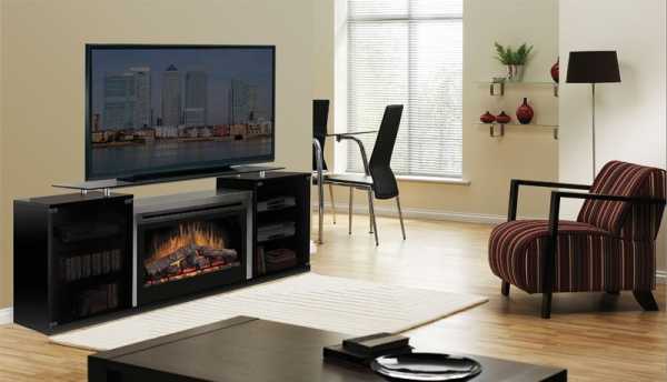 Интересным решением для гостиной, которое часто используют дизайнеры, является интеграция электрокамина с подставкой под телевизор. Таким образом все зрительное внимание приковывается к этому участку.