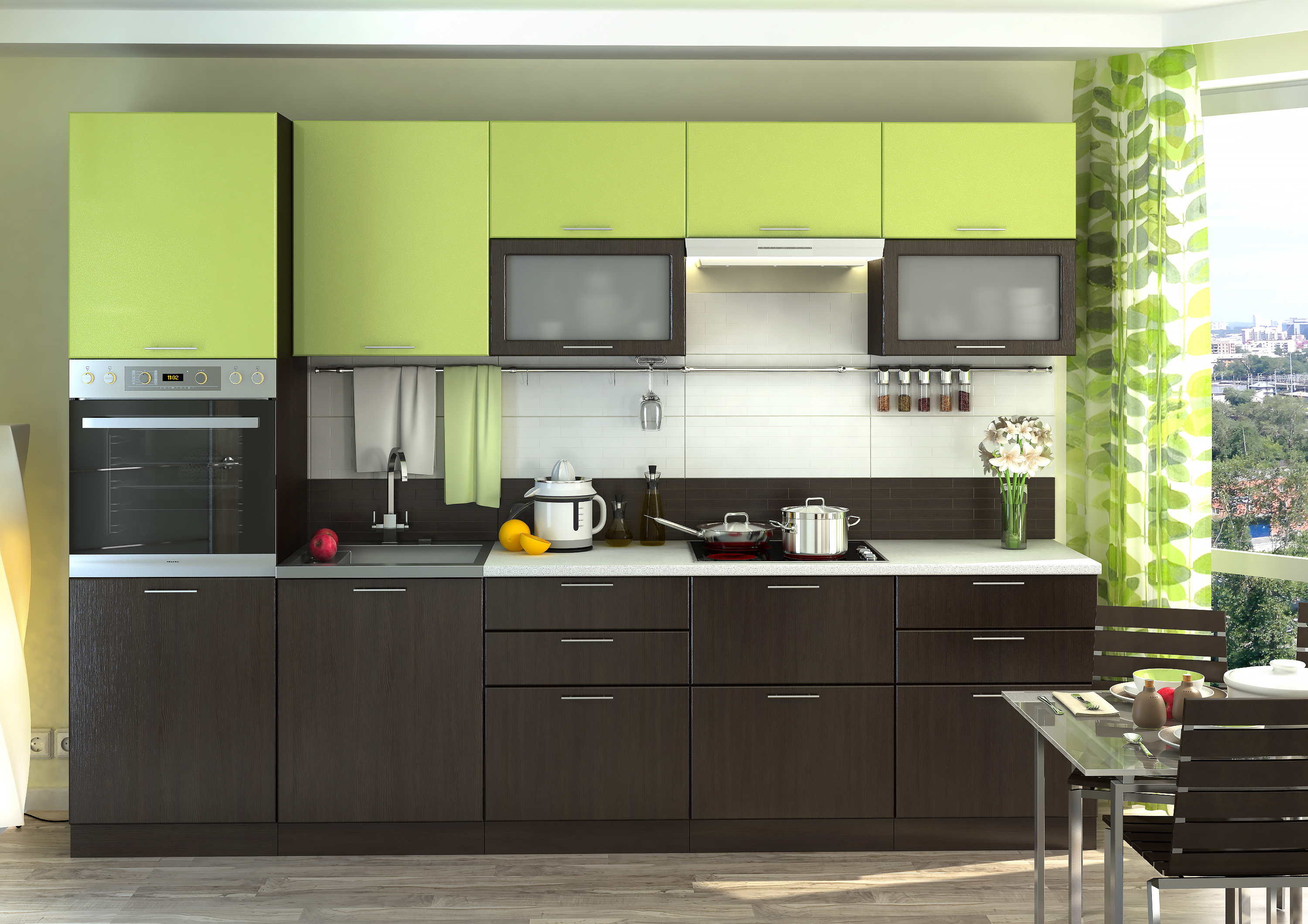 Прямая современная кухня с зелеными фасадами из пластика за 1800 долларов. Общая площадь кухни – 8 кв.м.