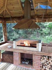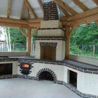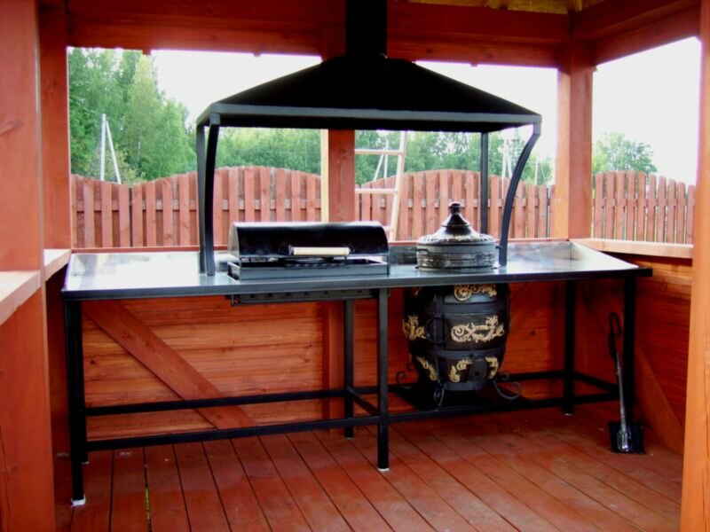 Важным моментом является конструкция беседки, она может иметь разную, но хорошо продуманную форму. Обычно ее делают полностью открытой, чтобы обеспечить полную продуваемость конструкции и хорошее выветривание газов во время готовки, но при желании всегда можно закрыть отдельные «стены», например, с подветренной стороны (см. фото).